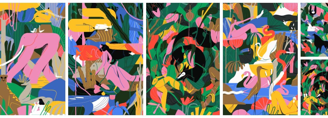La joven ilustradora Xoana Herrera crea universos en los cuales la naturaleza se impone. La artista diseña espacios cargados, con plantas y animales que crecen en armonía y se expanden en cada rincón que encuentran. Alejada de la figuración, sus ilustraciones tienen trazos intensos, profundos y líneas filosas que parecen cortadas por una tijera. En un medio ambiente que se manifiesta con fuerza, sus obras nos recuerdan que seguimos estando en medio de la naturaleza y todos los días tenemos la oportunidad de reconocerlo.