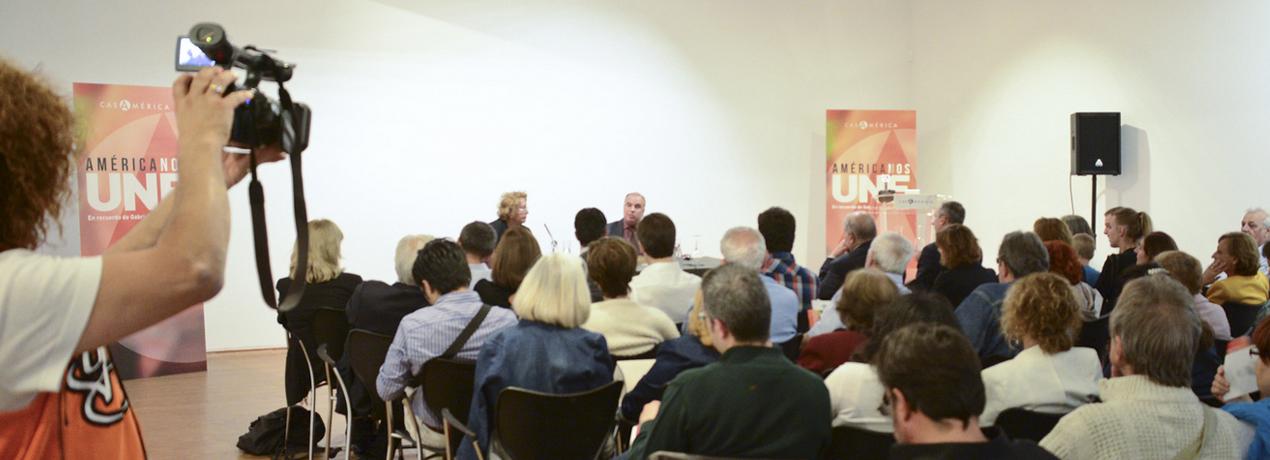 25/09/14. Diálogo entre Dolly Onetti (viuda del escritor) y Claudio Pérez (comisario de la exposición).